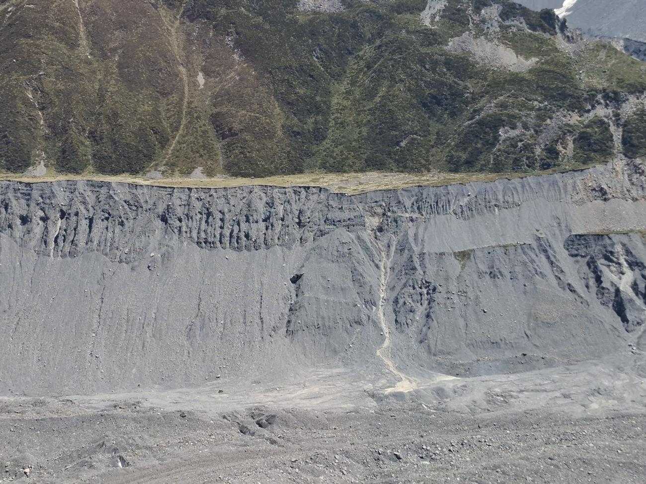 To reach the Tasman Glacier, continue on the track past Ball Hut for about 200m, until you reach a point where a large section from the edge of the terrace has been eroded into a gut in the moraine wall below (i.e. a huge bite has been taken out of the terrace edge). Start your descent here, dropping 100m down this gut onto a lower grassy terrace. The shape of the moraine wall changes every few years due to erosion, but this general area is likely to offer the best route for some time (2018).