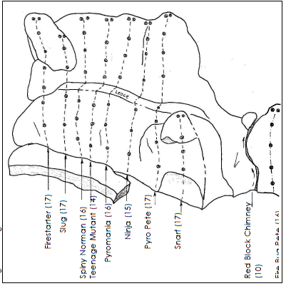 Just left of Teenage Mutant, and the last climb on the wall to cross the large ledge. Climb directly up the face, cross the ledge then continue up the head wall. |