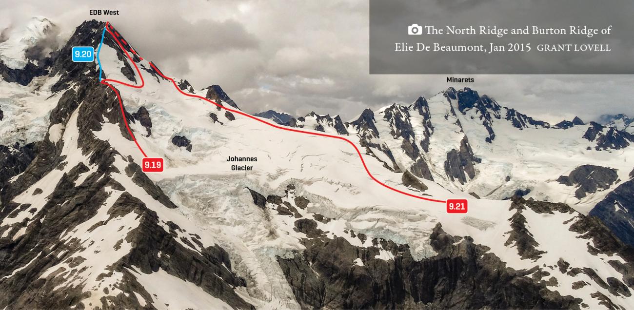 Gain the ridge via the Johannes Glacier, which is best reached from the lower Burton via a stream bed and couloir on the true left of the tip of the Johannes Glacier. Get to the true right side of the Johannes névé at about 2380m and ascend the rock ridge to Pt 2724m (six pitches of good red rock).