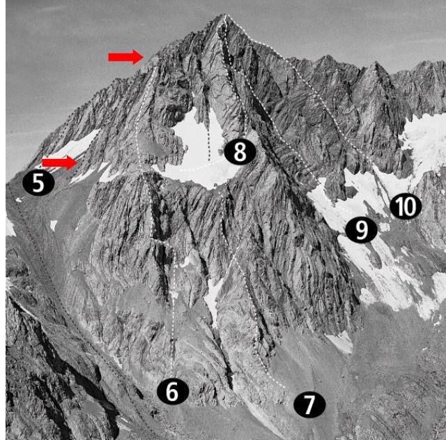 This ridge starts in the Cascade Glacier, but is usually gained at half height by traversing from Malte Brun Pass. Ascend on mediocre rock over the East Peak and on to the High Peak.