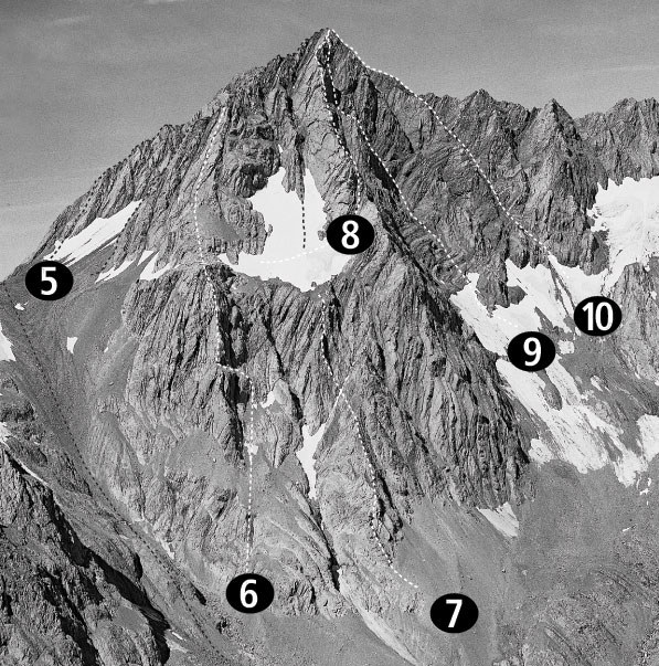 The lower half of the ridge is equipped (2017) with double bolt anchors to allow for 30m abseils. This line can be climbed directly (crux grade 12–13). If descending the ridge, the anchors are easy to find if you stay near the crest, unless the ridge is covered in snow. One of the upper abseils involves a slightly awkward leftwards traverse to avoid a gully. An intermediate bolt has been placed to assist with the traverse.