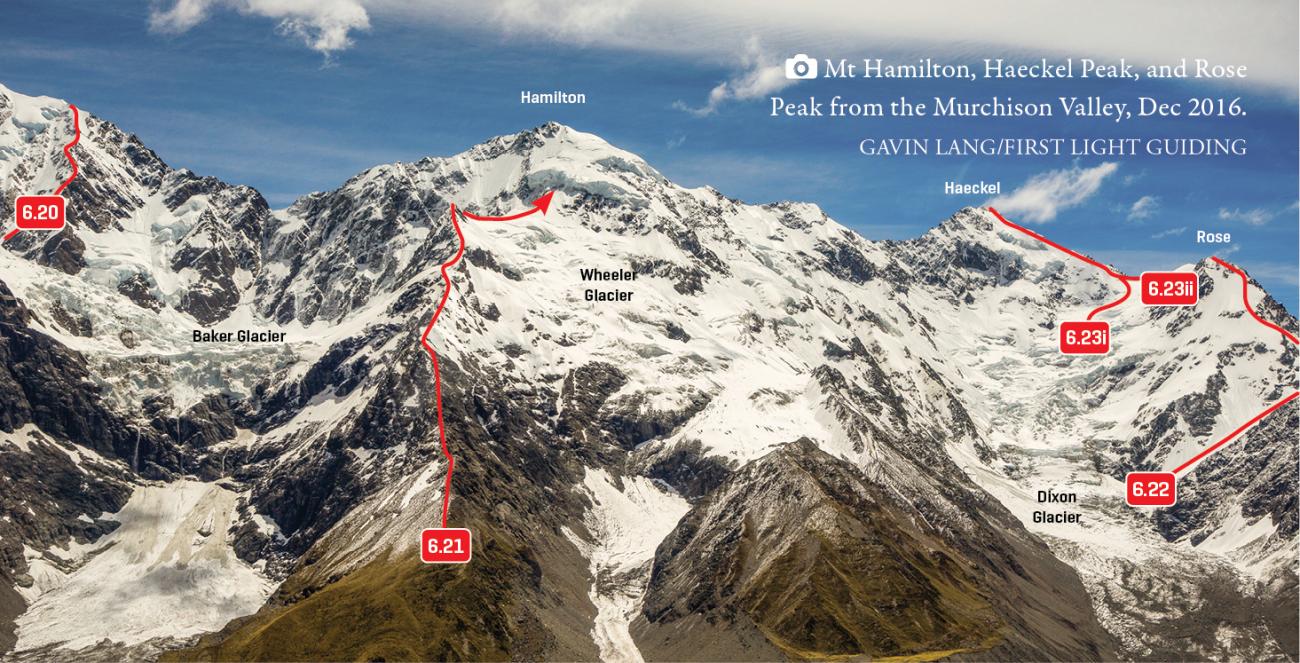 A rarely climbed but beautiful line. From the Murchison Valley floor, ascend the ridge between the Baker and Wheeler Glaciers onto a subsidiary peak, then up the snow arête to an ice bulge. The shape of the bulge, and its difficulty, changes over time. As at 2018, icecliff cut off the route, but the face to the left may offer a feasible route. After negotiating the bulge, continue up the face to the summit. Probably best in early summer.