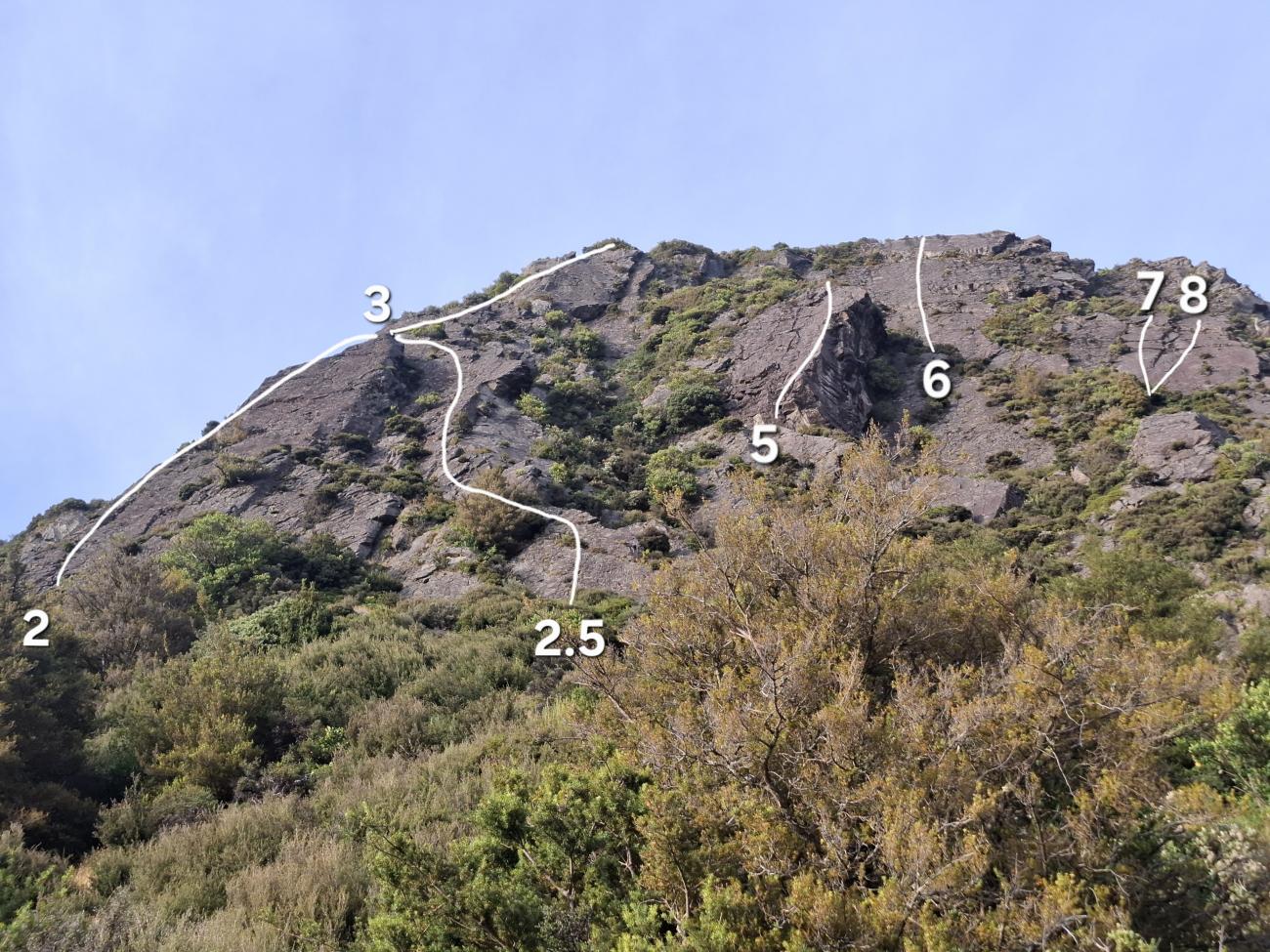 1st pitch starts from the ledge above the stream and steps left onto the rib. Continue up the rib to the trees to