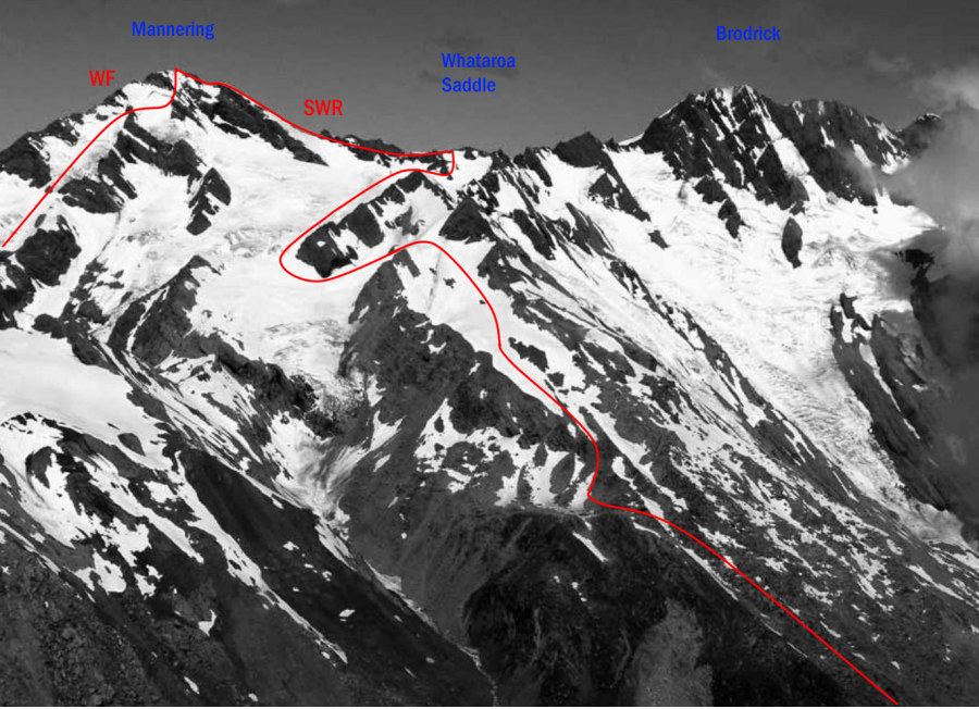 From Whataroa Saddle, ascend snow and rock on the Main Divide, passing an overhang near the summit by using a gut nearby. An alternative route from the saddle lies across slopes on the western side, approaching the summit from the south-west via a slabby rock rib.