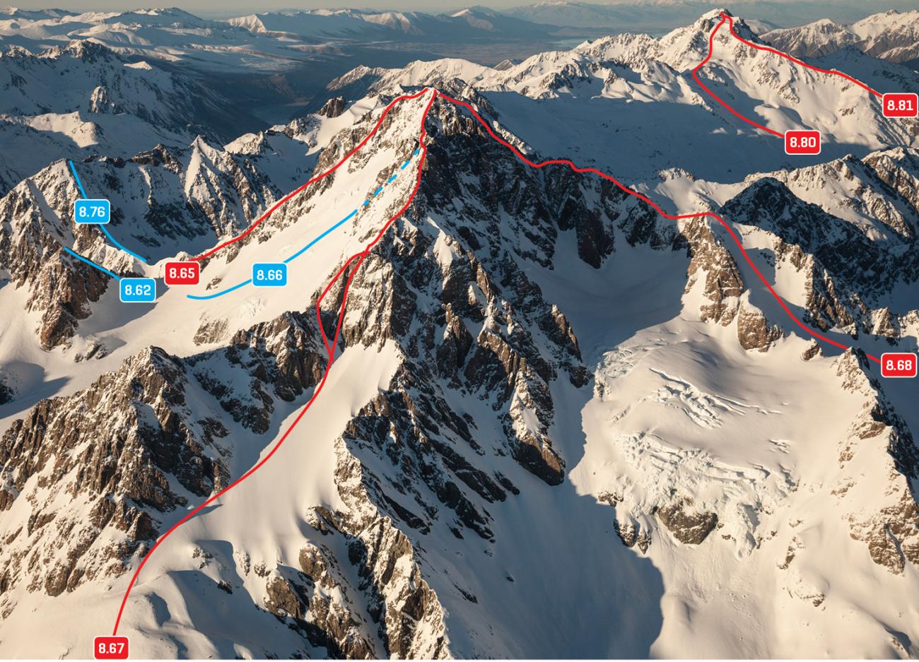 The saddle between McKinnon Stream and Tindall Stream can be reached from either the Godley or Macaulay valleys. If the upper Tindall Glacier is cut up, take a hard scramble up bluffs on the true right. Then follow the ridge and steep glacier slopes south to the north summit. If the icefall is too broken it can be bypassed by climbing Pt 2516m. The traverse from the north to the main (south) summit is mostly rock, and has a couple of difficult spots where some parties will want a rope.