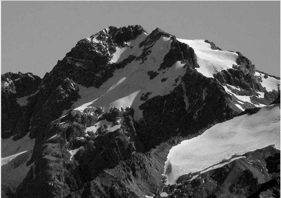 From the head of Godley River North Branch, this route ascends the steep buttress to the east of the hanging glacier to Pt 2633m, then up the South East Ridge to the summit. The buttress is wide and complex, and many different routes could be taken. The first ascentionists stayed near the crest, linking snow gullies with occasional steep rock steps.