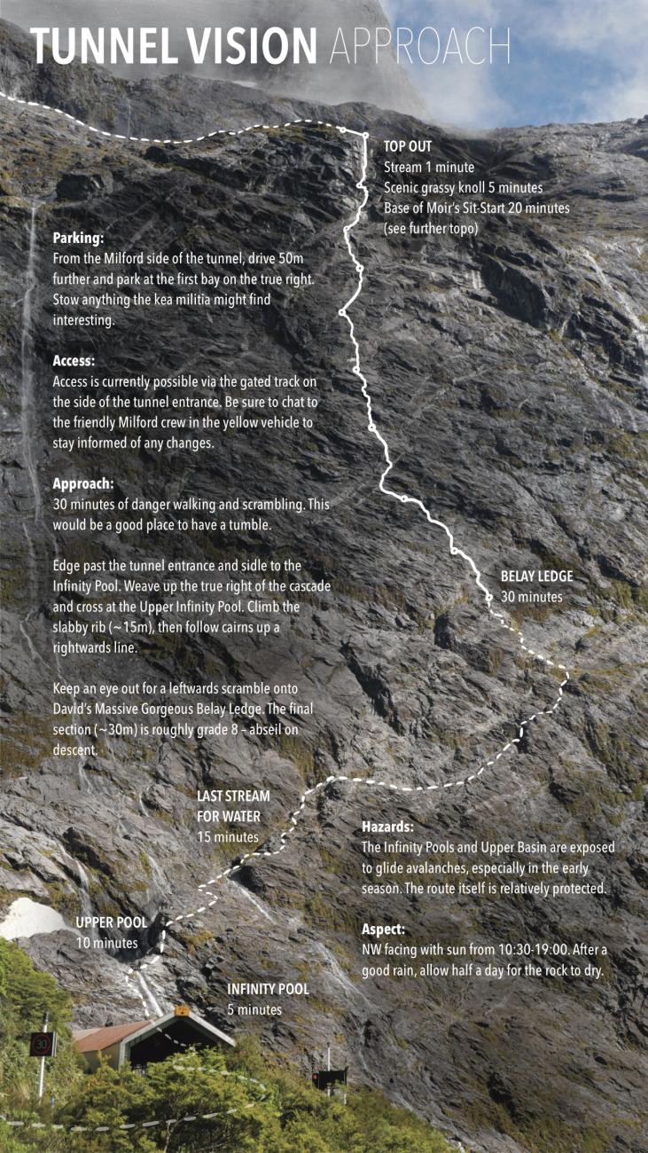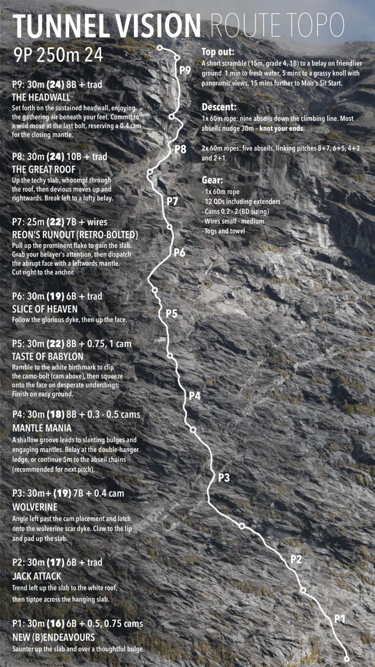 Tunnel Vision opens the Portal Wall with nine pitches rising in difficulty and exposure – not to mention a 30 min approach, dips in the Infinity Pools and link-ups with the Moir classics.