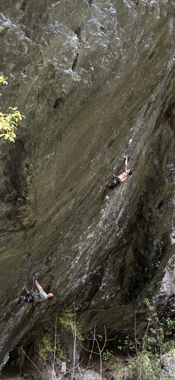 Start on the hanging slab on the right of the crag to the ledge before embarking up the overhang, trending left towards the 'Warhol'.