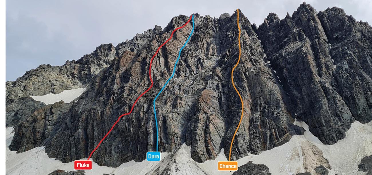 Follow the next major rib right of Fluke. Scramble moraines and snow remnants up towards the base of the peak, with a few steps across Firn snow to the base of the central buttress of the rib. Climb loose blocky rock for the lower/steeper half, following weaknesses close to the crest of the rib, then on quality rock thereafter [On the lower half, much better rock and climbing could be had on the right of the arete, but at a higher grade and with minimal gear]. Above, where the angle eases and the tock improves, round the first tower on the left, and the second on the right. From the top, traverse across several towers along the ridge to the summit. On FA, 1 hr 25 for Chance, plus 25mins to summit; then descent was circuitous, made via the great ridge to Glentanner peak and down Twin Stream.
