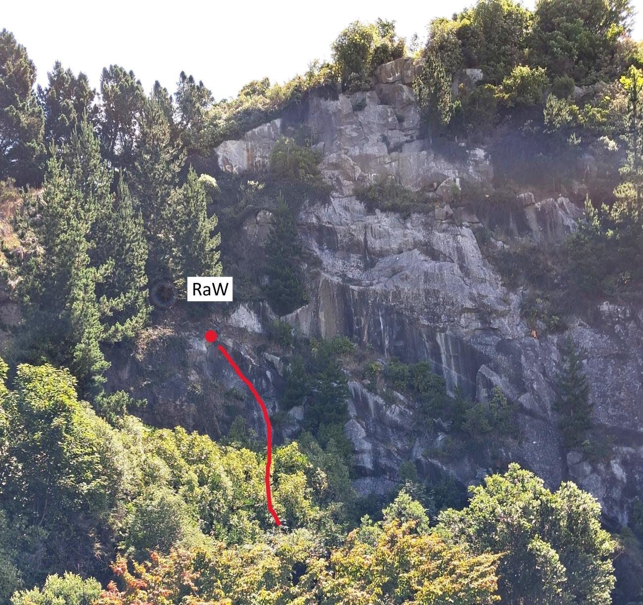 Up the fixed hand line a couple of metres left of The Great Escape track (behind the workers shed). Step onto the slab from a toe sized pocket then thoughtfully up the line of bolts. Good quality rock and moves.