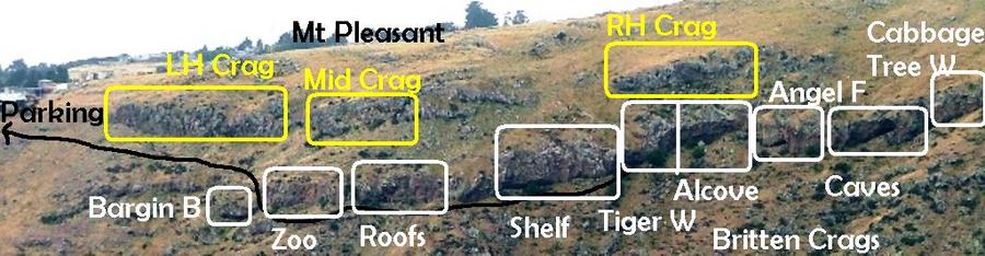 To approach from the north drive right up Mt Pleasant Road to the intersection with Summit Road, turn right, and park opposite Broadleaf Lane, or further along as for Cattlestop Crag. It is possible but slow to walk along the base of Cattlestop as far as you like, to access the southern walls of Britten Crags, but it's easier to walk northward above the cliffs and abseil at a convenient abseil station, though this requires some local knowledge. Take care, as the grass slopes above the cliffs are steep, and can be slippery.